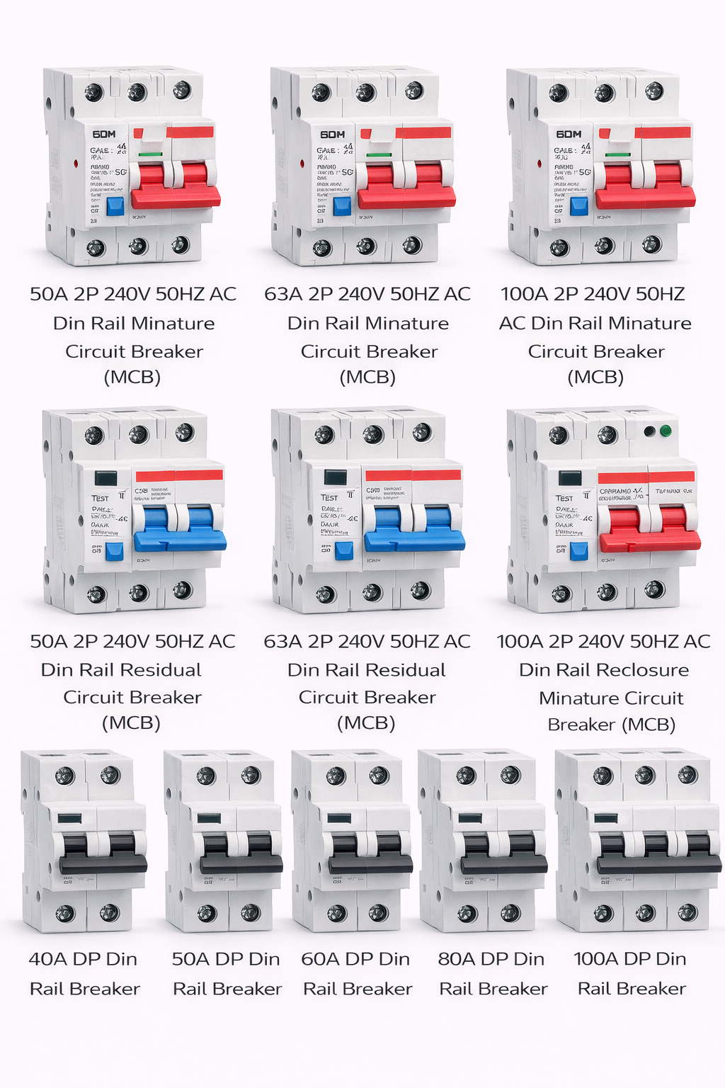 50A Miniature, 63A Miniature, 100A Miniature, 50A Residual, 63A Residual, 100A Residual, 40A DP, 50A DP, 60A DP, 80A DP, 100A DP