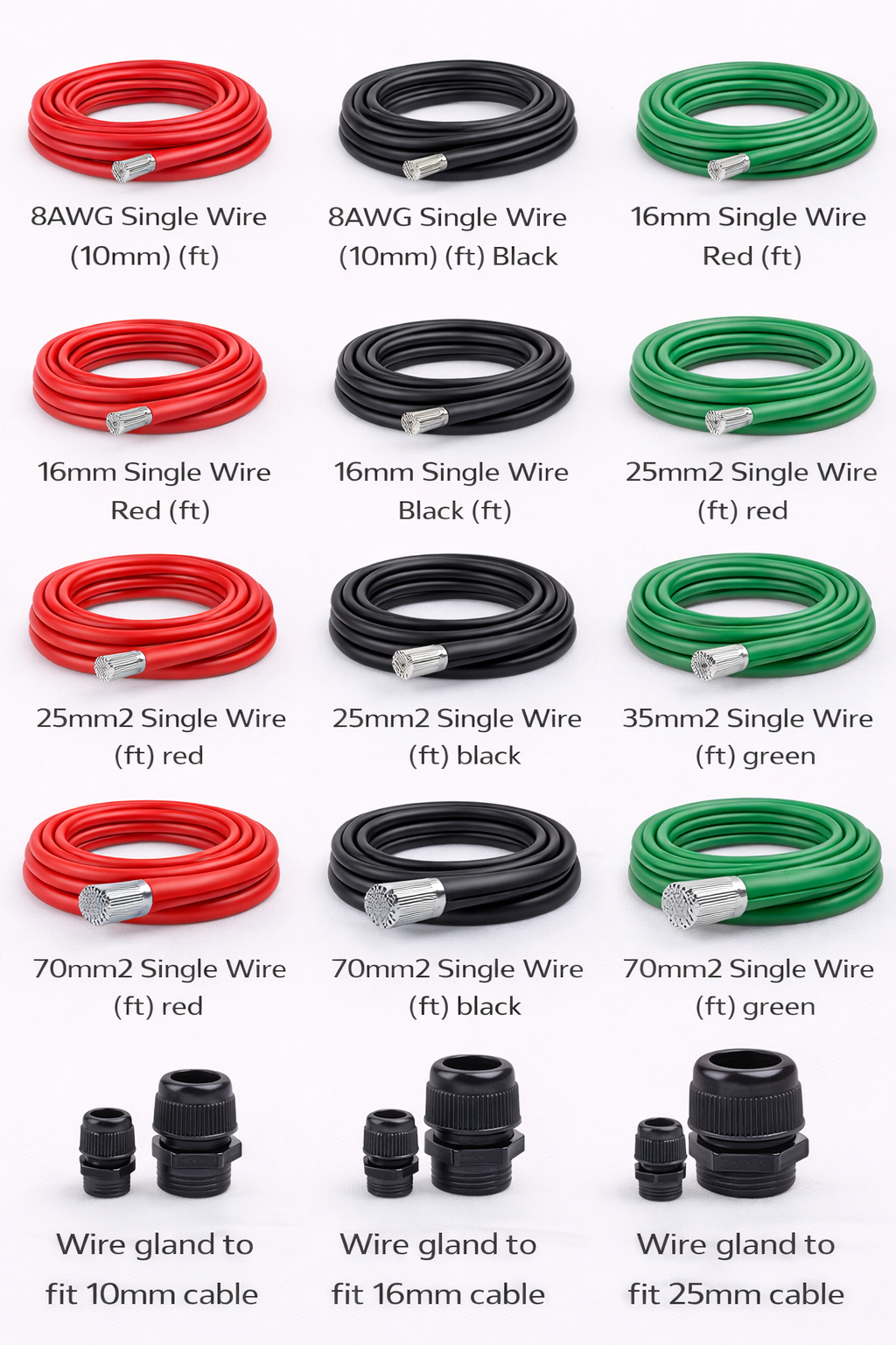 | Types | 8AWG Single Wire (10mm) (ft) Red, 8AWG Single Wire (10mm) (ft) Black, 8AWG Single Wire (10mm) (ft) Green, 16mm Single Wire Red (ft), 16mm Single Wire Black (ft), 16mm Single Wire Green (ft), 25mm2 Single Wire (ft) red, 25mm2 Single Wire (ft) black, 25mm2 Single Wire (ft) green, 35mm2 Single Wire (ft) red, 35mm2 Single Wire (ft) black, 35mm2 Single Wire (ft) green, 70mm2 Single Wire (ft) red, 70mm2 Single Wire (ft) black, 70mm2 Single Wire (ft) green, Wire gland to fit 10mm cable, Wire gland to fit 16mm cable, Wire gland to fit 25mm cable |