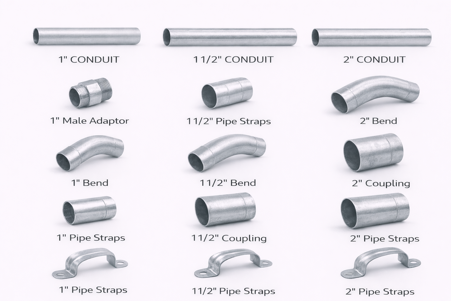 1" CONDUIT, 1" Bend, 1" Coupling, 1" Pipe Straps, 1 1/2" CONDUIT, 1 1/2" Pipe Straps, 1 1/2" Bend, 1 1/2" Coupling, 2" CONDUIT, 2" Bend, 2" Coupling, 2" Pipe Straps