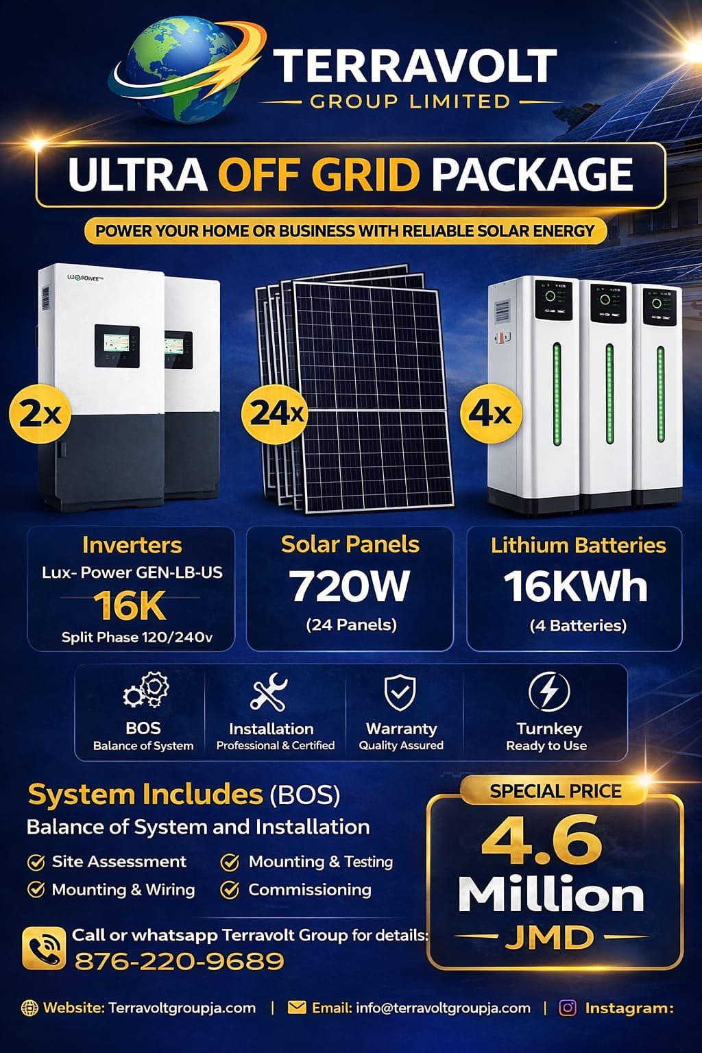 Power your home or business with a fully independent solar energy system. This ultra off-grid package includes high-capacity inverters, premium solar panels, and lithium battery storage, along with full installation and commissioning.